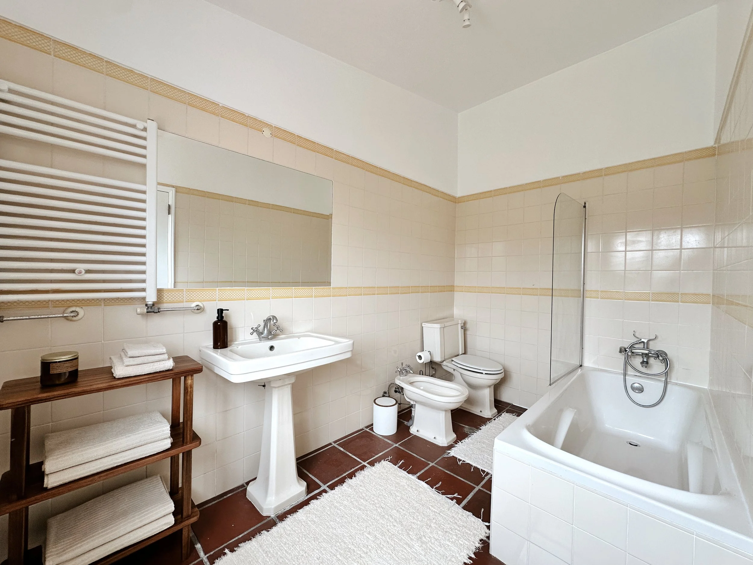 in the bathroom, we didn’t change much. we’ll do a full makeover at some point. we’ll do a tadelakt and concrete bathroom, but for now we gave it a quick refresh - replacing the shower door, swapping out light fixtures, painting, and updating decor.